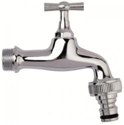Krómozott 3/4" kerti csap fém gyorscsatlakozóval. A kerti csap 3/4 colos külső-menetes bekötésű és 1 colos külső-menetes kifolyóvégű. A csap csak egyállású hideg vizes kiszerelésben kapható. Kifolyó: szelep záras